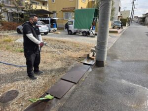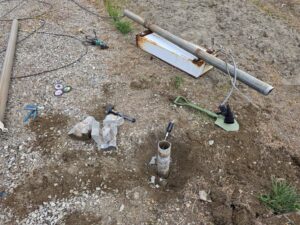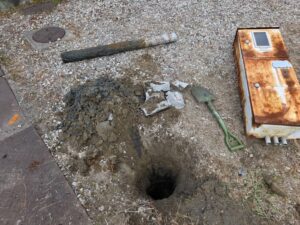 敷地内にある電設ポールの解体撤去と空中架線撤去をさせていただきました。 ポールにかかるケーブル(空中架線)の切り離し撤去、 電設ポールの基礎部分を切り離してポールが埋まっていた基礎を掘り起こし 撤去後にできた穴を土で埋め戻し、転圧して現状に復旧して掃除をして完了しました♪ ポールが何かに引っかかっていて、なかなか抜けなくて佐々木君と社長が頑張ってくれてました!!